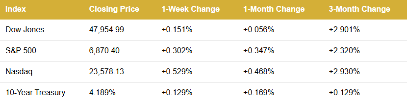 Welcome to our weekly market update. This newsletter is designed to provide you with current market data, investment insights, and educational information about market trends and strategies. The content herein represents our observations and analysis of market conditions and is intended for informational and educational purposes only. It does not constitute personalized investment advice or a recommendation for any specific security or strategy.